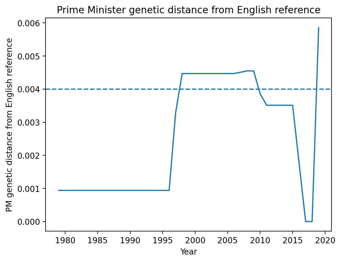 Overlaying the average full year genetic distance of Prime Ministers onto this series produces a striking alignment. Periods in which the Prime Minister is genetically closer to the English reference tend to coincide with lower immigration levels. This relationship survives basic controls for time, though it would be naïve to treat this alone as decisive evidence.