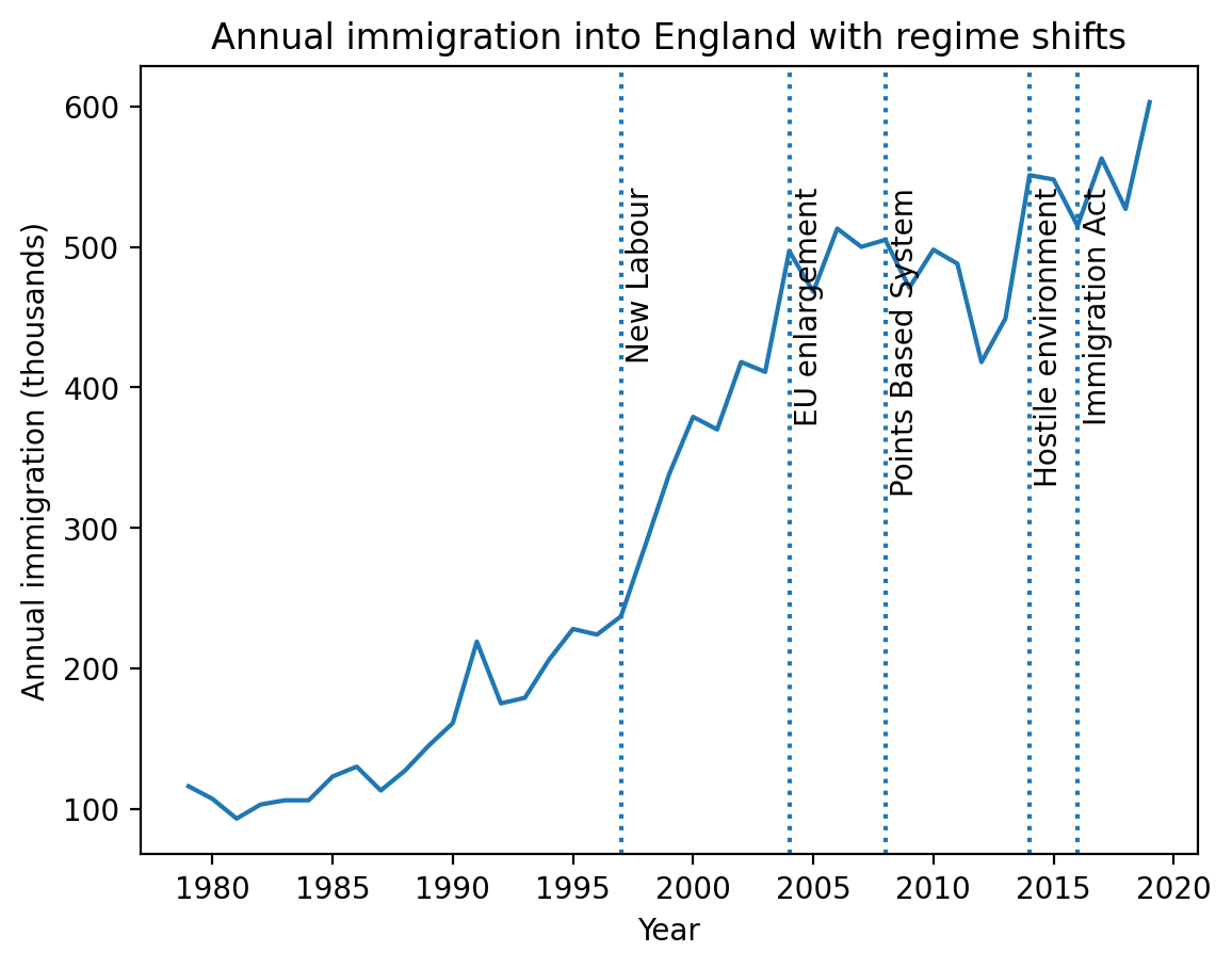 When annual immigration levels are plotted against time, the familiar picture emerges. Immigration rises substantially over the period, but not smoothly. Instead, it advances in steps, settling onto higher plateaus which then persist. This alone suggests that explanations framed purely in terms of short-term economic demand or administrative error are incomplete. Something, or several things, are periodically resetting the baseline.