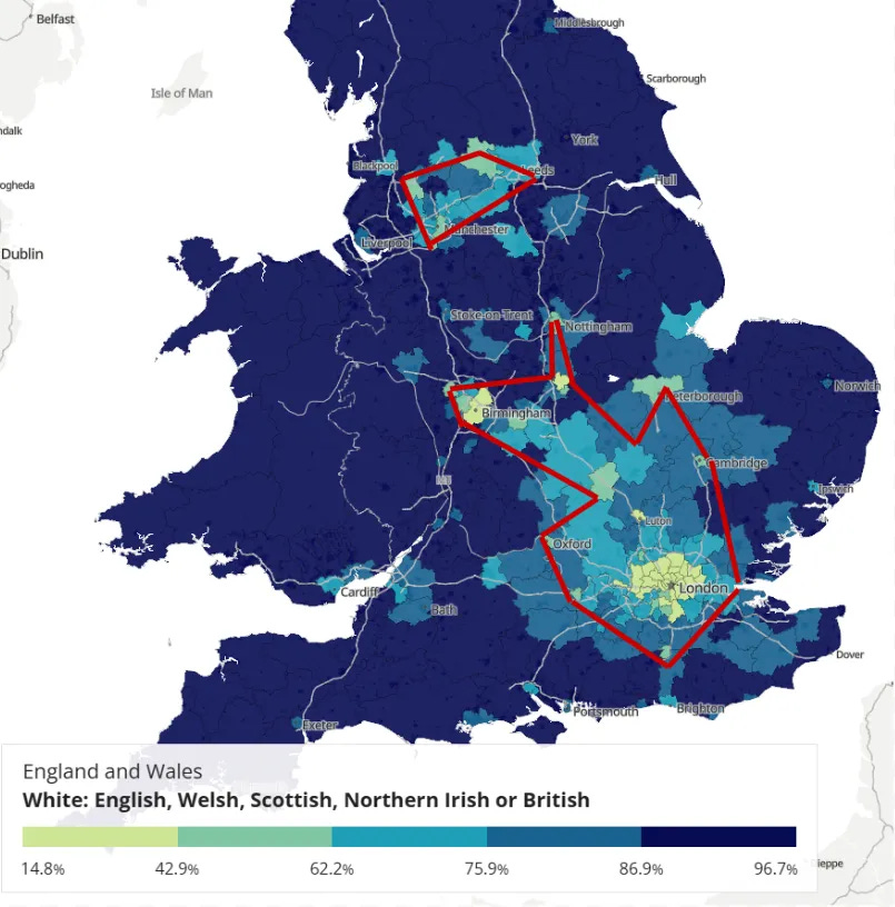 The same pattern has occurred across the Midlands, and I’ve met Anglo-Saxons who abandoned Leicester for Canada after the state ramped up its local demographic transformation process in the 1970s. Most chose closer areas to settle, creating a youth population inversion with around a quarter of Leicester's children being White British, but only around a quarter of surrounding Leicestershire's children being non-White British.
