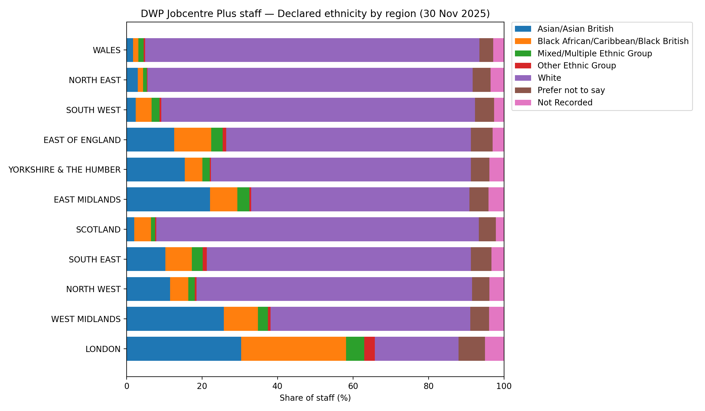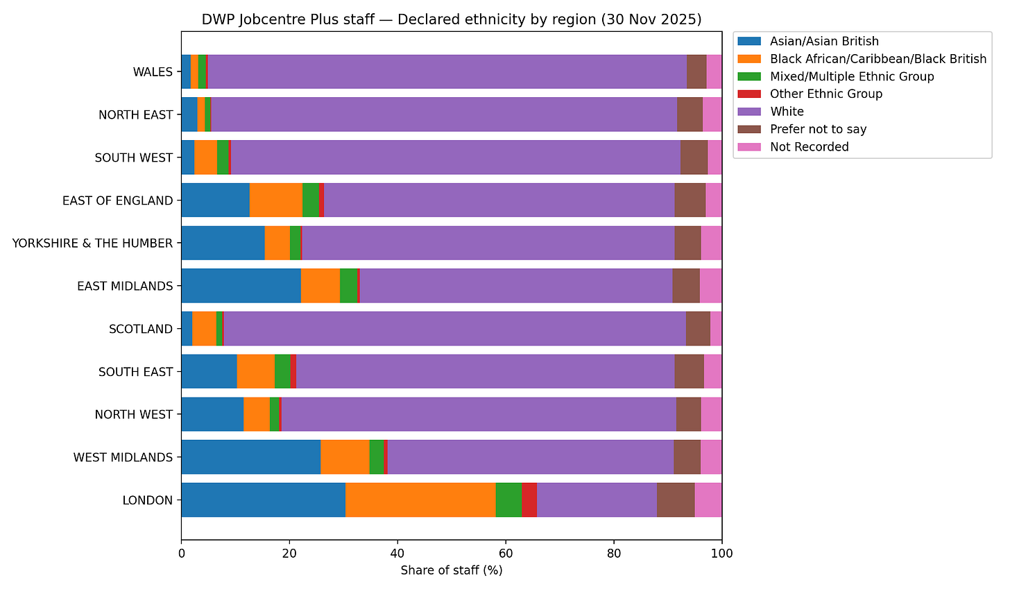 All jokes aside, the DWP follow standard civil service recruitment policies regarding nationality, so the rather unusually sounding practice of hiring foreign nationals to address domestic unemployment prevails. The state also has a semi-formal racial preference hierarchy for recruitment, with middle-aged white British men at the bottom of the pile for being “too pale, stale and male”. That’s partly why only 22% of London's Job Centre workers are even recorded as White, let alone White British.
