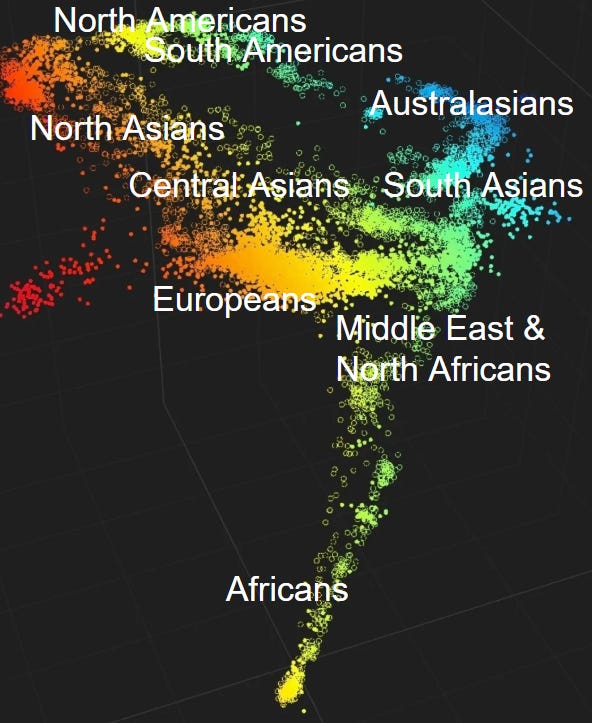 Everyone has genetic coordinates, whether they like it or not. These tend to be clustered into ethnic groups, and are then averaged out to give that group’s coordinates, which can be plotted with others in a pretty 3D chart. These coordinates are typically plotted in 2D or 3D due to our human brains not being able to comprehend the standard format, simplified into a mere 25 dimensions.